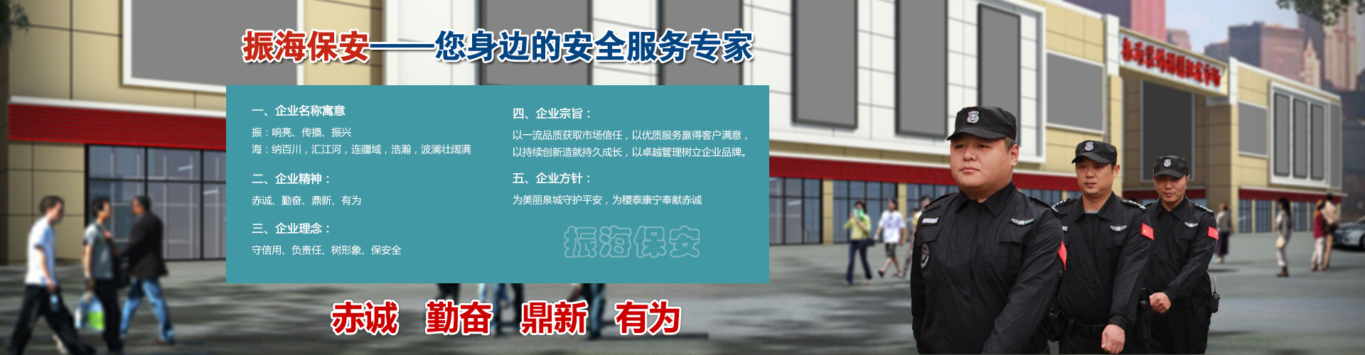 山東振海保安服務有限公司是一家專業(yè)的保安服務公司,提供人防安保、臨時勤務安保、危機處理安保、犬防安保、反跟蹤、調(diào)查、商業(yè)間諜等服務,公司成立于2015年5月,是通過國家公安部門資質(zhì)認證,經(jīng)山東省公安廳和濟南市工商局批準成立的綜合性民營保安公司。公司立足濟南,面向山東省內(nèi)外,開展的業(yè)務涵蓋人防、技防、安檢、守護、隨身護衛(wèi)、大型活動特勤等安保項目。公司總部坐落于濟南市市中區(qū)英雄山立交樞紐南側(cè)振海裝飾材料市場大樓;公司培訓基地位于濟南市南部山區(qū)。